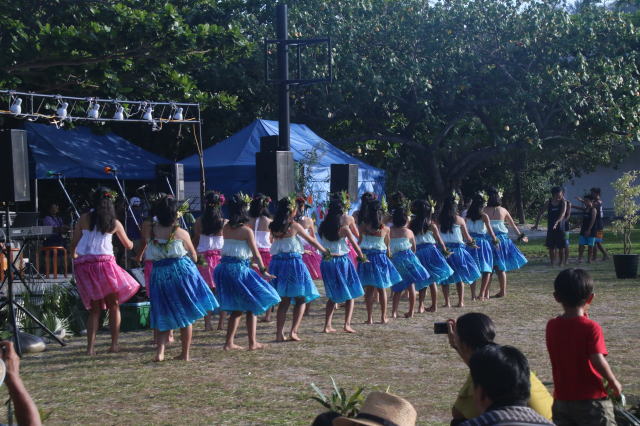 | 今回は2航海だったので、島の休日にあたる出航中を島で過ごしました。 宿の向かいにある公園で、ちょうどフラダンスの大会が行われていました。 島の女性はフラダンス率がとっても高いらしく、小さな子供から大人まで様々なチームが出場していました。 とっても手作り感たっぷりのイベントでした。 |