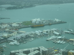 | Sky Tower の展望台から見た、アメリカズカップビレッジ周辺です。 中央付近にボートが入るくらいの巨大なドックが並んでいます。 私が行った時には8チーム分ありました。 |
