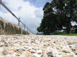 | 上の写真の散歩道にカメラを置いて撮りました。 何だか分からない写真になってしまったので失敗なのですが、実はこの道、砂利ではなく、貝殻を敷き詰めてあります。 |