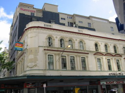 | 今回泊まった宿 Queen Street Backpackers です。 最もにぎやかな Queen Street に面しています。夜は2時くらいまでうるさくて寝られません。 |