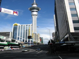 | オークランドのシンボル "Sky Tower" です。すぐ横のビルが10階以上あるのに比べても、その高さが分かります。 東京タワーのように、上下2つの展望台があります。 |