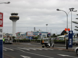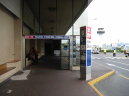 | NewZealand初日のオークランド国内線空港ターミナルの入り口前です。 入り口手前右側に建っているのは市内への有料バスと国際空港ターミナル(この写真の奥900mくらい)への無料バスの共同バス停です。 |
