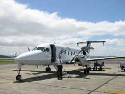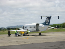 | 上の写真の後のロトルア空港です。19人のりの小さなプロペラ機でした。小さい分揺れますが、NZ航空のパイロットは腕が良く、離着陸のときも非常にスムーズで快適でした。 ただし、飛んでるときはいかにも「操ってる!!!」ってな感じで、乗り物に弱い人はつらいかも… |