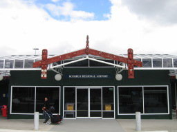| ロトルア空港の正面です。 これは帰りに撮影したものですが、来たときに私の荷物は写真の左側のあたりにカートごと置いてありました。 ちなみに、周囲に人影はありません。(市内から歩いてこられる場所でもないですし…) |