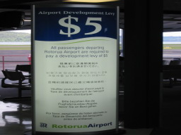 | 同じくロトルア空港の建物内部です。ここから出発する人は空港利用税としてNZ$5を払わなければならないことを言っています。何と7ヶ国語で書いてあります。 | |