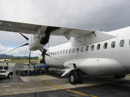 | この写真の場所はロトルア空港で、クライストチャーチへ行く飛行機です。 前回は19人乗りでしたが、今回は66人乗りでした。でも、プロペラ機です。コーヒー、紅茶などサービスも良く、相変わらずパイロットの腕も良いので快適でした。 |