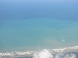 | クライストチャーチへ行く、上の飛行機から見た海です。北島と南島の間に差し掛かりかけているところです。手前の陸は北島です。 岸から少し離れたところでいきなり海の色が変わっているのです。なんで? |