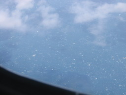 | 上と同じく機内からです。南島の東側の海なのですが、写真上の雲とは別に、海面に小さな白いものがたくさん見えますが何だか分かりません。ちなみに小さいのは高いところから見ているからで、実際には各々小型船くらいの大きさがあります。何なんだろう? | |
