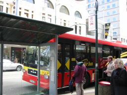 | クライストチャーチ空港から市内へのバスです。 この写真は市内中心部の大聖堂広場脇にあるバス停で、空港行きのバスはここから出ます。 |