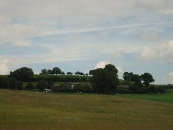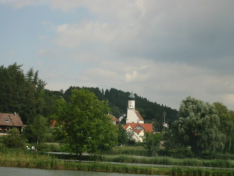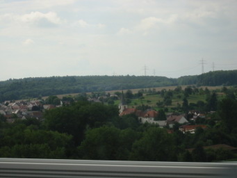 小さな街です。郊外では、どこも大体こんな感じの町並みのようです。 普通の建物は、茶色い屋根に白い壁。街の真中には、のっぽの教会があります。 |