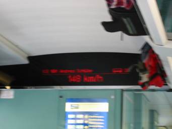 ぶれていますが、ICEの中です(2等席)。 各車両の両端に電光掲示板があり、様々な案内や現在の速度などが表示されます。最高で250[km]くらいは出ていました。 |