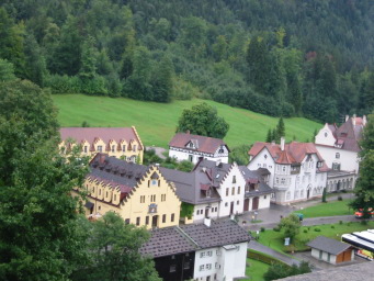 ホーエンシュヴァンガウ城は小高い丘の上にあります。この写真はホーエンシュヴァンガウ城から付近(ほとんどホテル)を見下ろした写真です。 |