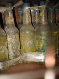 | 館内には販売中止になったものが保管されている棚が ありました。 その中で最も古いものは30年以上経過していて、 ビンの外側がカビだらけになっていました。 |