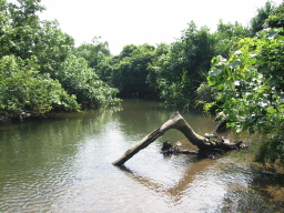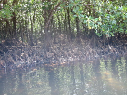 | 引き潮の時間で川の水位も低くなっています。 この支流とヒナイ川は高低さが少なく、潮の満ち引きに川の 水位が影響を受けています。 当然川の水にも海水が混じっています。 そんなところにマングローブの林が広がっています。 |