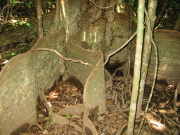 | カヌーを降りて、滝の上に向かう途中です。 この木はサキシマスオウノキという根が板状になっている 不思議な木です。 なんと天然記念物だそうな。 この島には、いたるところに天然記念物があるようです。 |