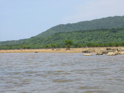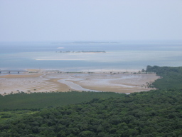 | 滝の上からの景色です。 この滝は海から近いため、すぐ向こうに海が見えます。 海岸沿いにある木の生えていない場所は、干潮のために 干上がった場所で、潮が満ちてくると水没します。 ブイが置いてあるらしく、歩いてくる際には干潮時に干潟 部分を通ってくることもできるそうです。 |
