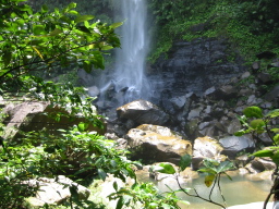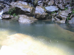 | 滝つぼ部分です。 かなりの大きさがあり、泳ぐことができます。 この日は陽射しは強烈でしたが、気温はそれほどでもなく、 泳いだら寒かったです。 |