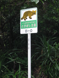 | イリオモテヤマネコが交通事故にあうケースが 増えているそうです。 現在イリオモテヤマネコの生息数は約100頭と考えられており、 1頭が死んだだけでも個体数の1%が死んだことになってしまい ます。 また、どの場所に生息しているのかを調査する目的もあり、 このような看板には場所を示す記号が書かれています。 写真は「D-0」地点の看板です。 |