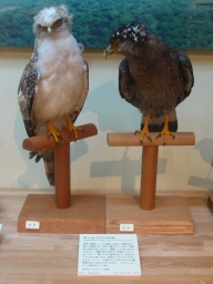 | カンムリワシの剥製です。 左の白いのは子供です。 右の茶褐色のものが大人です。 |
