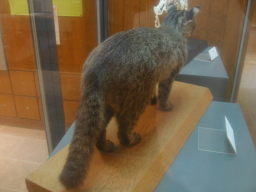 | イリオモテヤマネコの剥製です。 家猫に比べて耳の先端が丸くなっているのが特徴です。 |